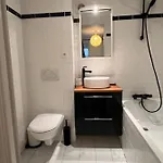 Das Duplex 10 Minutes From The Beach In Trouville verfügt über eine Dusche und eine Waschmaschine für Ihren Komfort. Das Badezimmer ist mit einem Haartrockner und Badelaken ausgestattet.